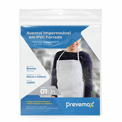 Avental de segurança confeccionado em tecido sintético, revestido em PVC.
