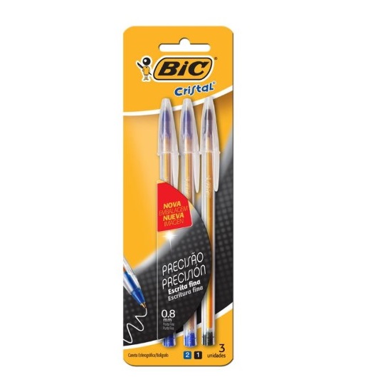 Caneta Cristal Fina Com 3 Unidades (2 Azuis e 1 Preta) – Bic