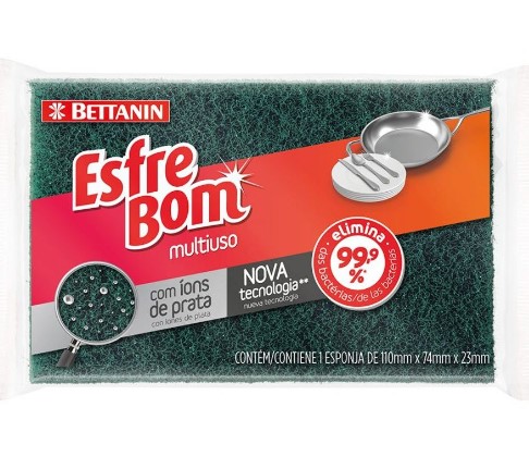 Únicas do mercado a possuírem os íons de prata que eliminam até 99,9%* das bactérias, a esponja EsfreBom Multiuso recebe agora uma tecnologia** inovadora que além de manter a cozinha mais limpa e segura, proporciona toque suave, oferecendo maior conforto na hora da limpeza, e maior resistência ao rasgo durante o uso.