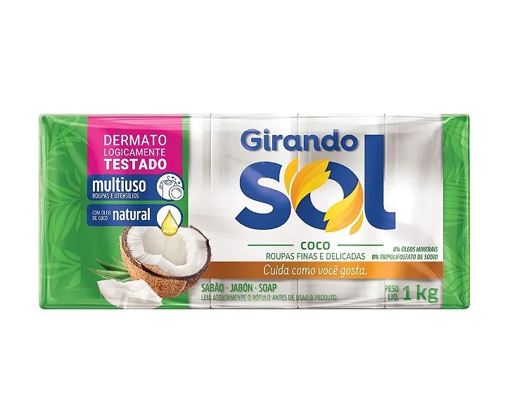 Sabão Coco – Limpeza eficiente com suavidade. Especial para roupas finas e delicadas. Formulado a base de óleo de babaçu. Elimina até 99% das bactérias e germes.